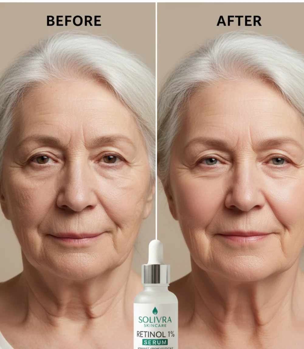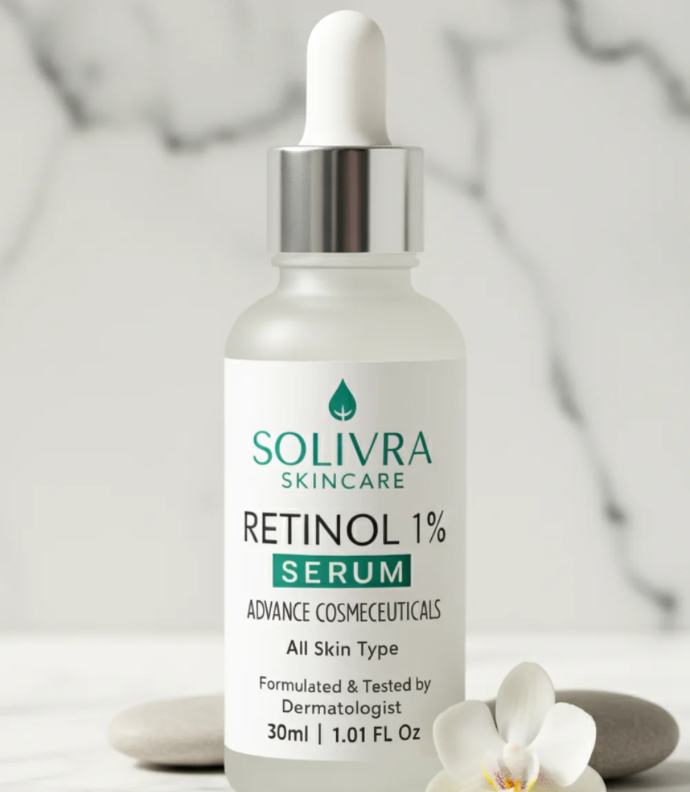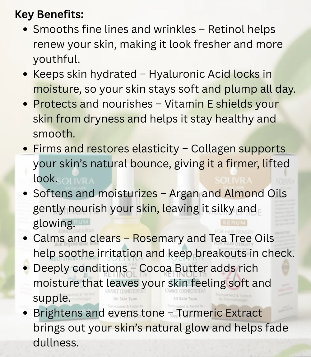 Wake up to youthful, glowing skin with Solivra Retinol Serum — a lightweight, overnight treatment that smooths fine lines, evens tone, and restores radiance. Infused with Retinol, Hyaluronic Acid, Vitamin E, and Collagen to hydrate, firm, and protect your skin for a fresh, renewed glow every morning.